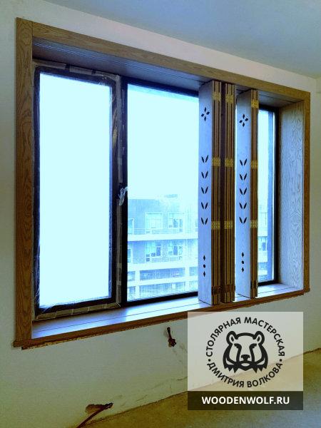 Оформление окон откосами, наличниками, ставнями, подоконниками, полками и пр.